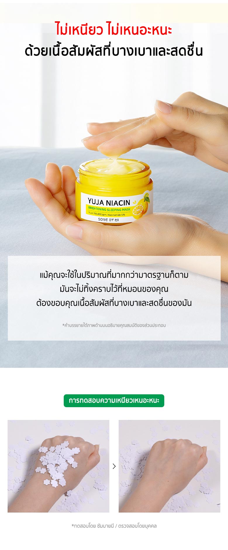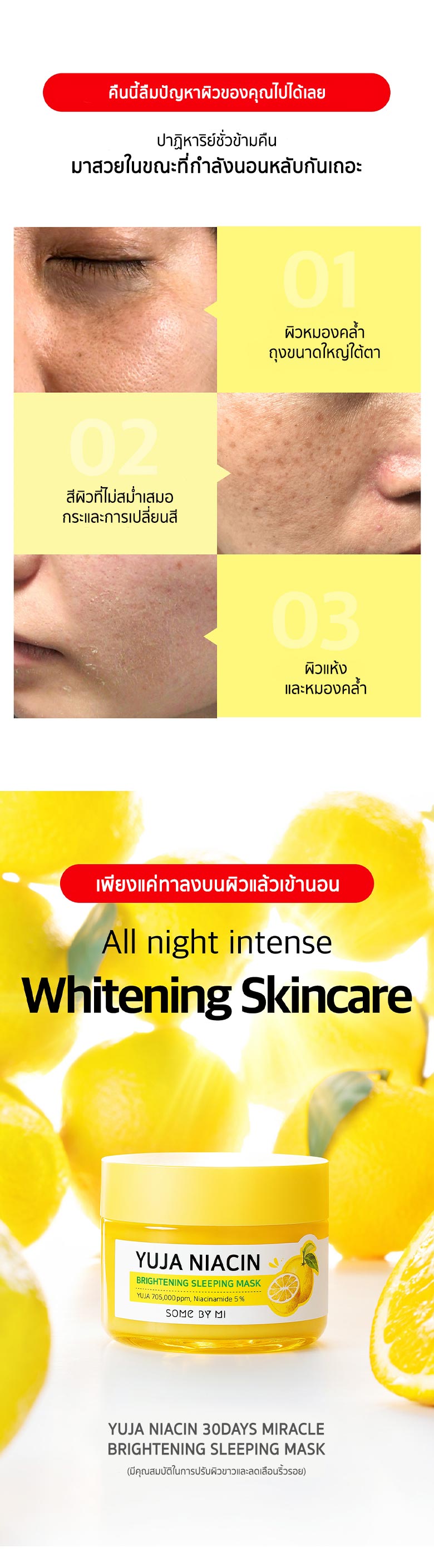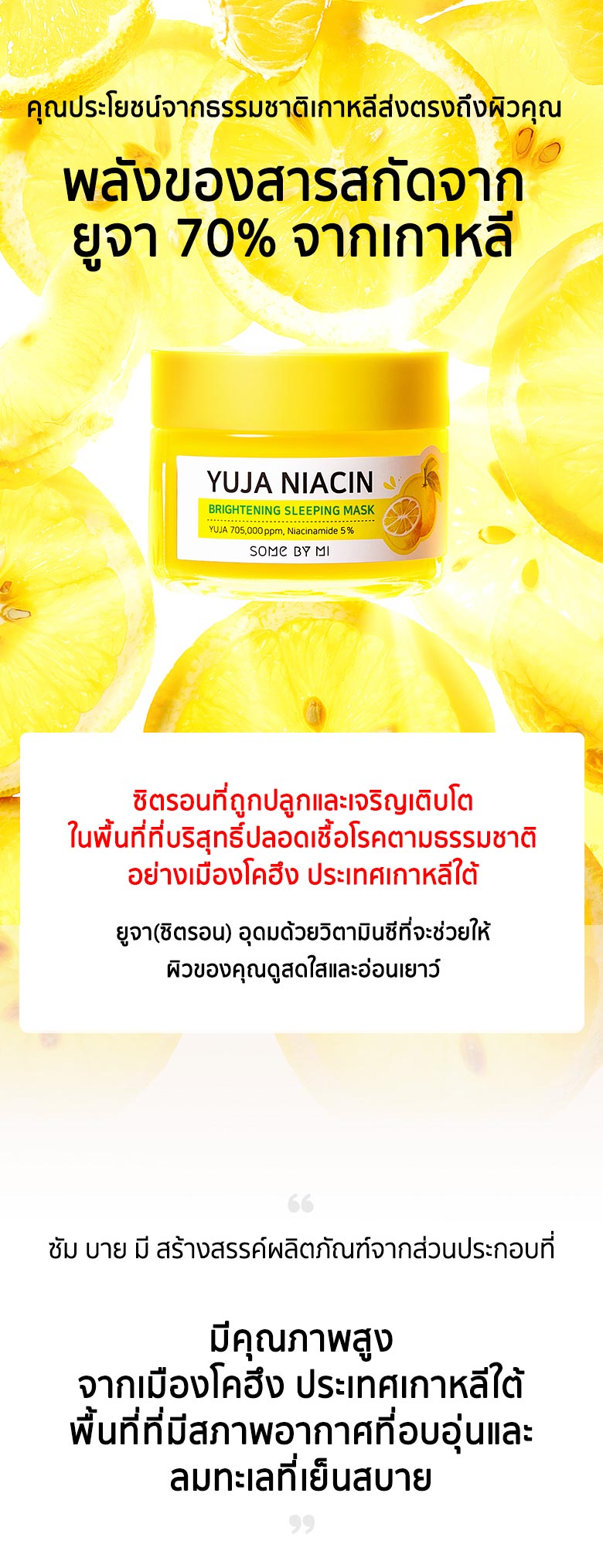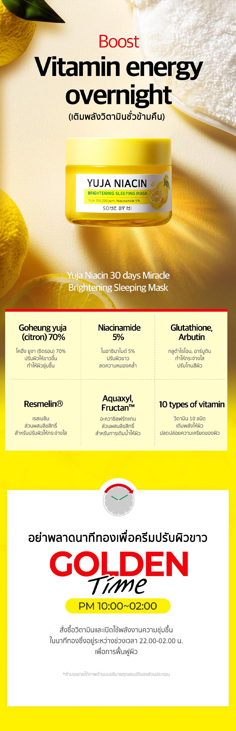 SOME BY MI YUJA NIACIN 30DAYS MIRACLE BRIGHTENING SLEEPING MASK 15Gมาส์กปรับสภาพผิวใหม่จาก ซัม บาย มี สวยใสหลังตื่นนอนด้วยส่วนผสมหลักจาก ส้มยูจา 70% ของเมืองโคฮึงช่วยปรับสภาพผิวได้แบบ 2 IN 1ทั้งปรับสภาพผิวให้ขาวกระจ่างใส และเพิ่มความชุ่มชื้นให้ผิวกลิ่นของยูจายังช่วยให้คุณผ่อนคลาย เนื้อครีมซึมซาบเร็วบางเบา สดชื่น ไม่เหนียวเหนอะหนะ ปริมาณสุทธิ 15 กรัม