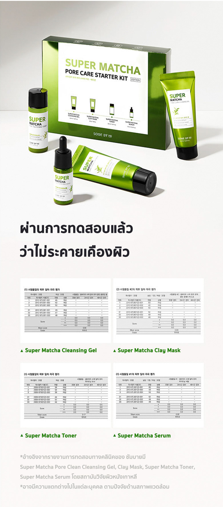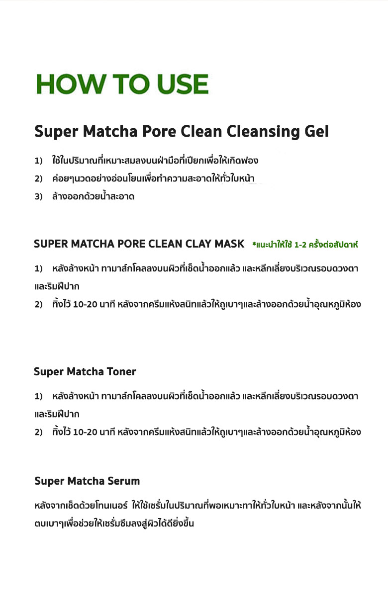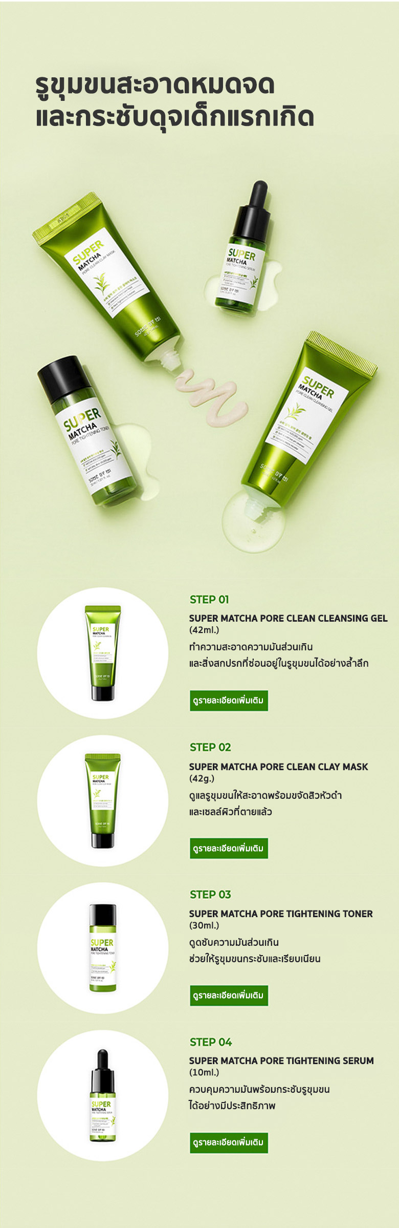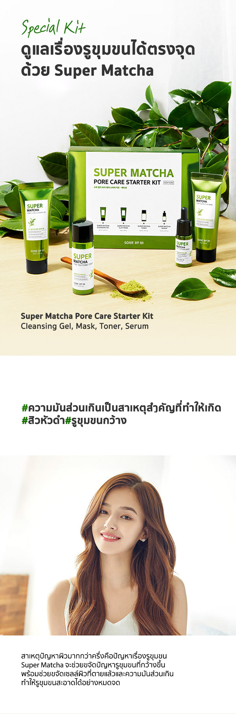 ด้วยพลัง SUPER MATCHA ควบคุมความมันส่วนเกินซึ่งเป็นสาเหตุสำคัญที่ทำให้เกิดสิวประกอบไปด้วย1.SOME BY MI SUPER MATCHA PORE CLEAN CLEANSING GEL ขนาด 42 มิลลิลิตร2.SOME BY MI SUPER MATCHA PORE CLEAN CLAY MASK ขนาด 42 กรัม3.SOME BY MI SUPER MATCHA PORE TIGHTENING TONER ขนาด 30 มิลลิลิตร4.SOME BY MI SUPER MATCHA PORE TIGHTENING SERUM ขนาด 10 มิลลิลิตร
