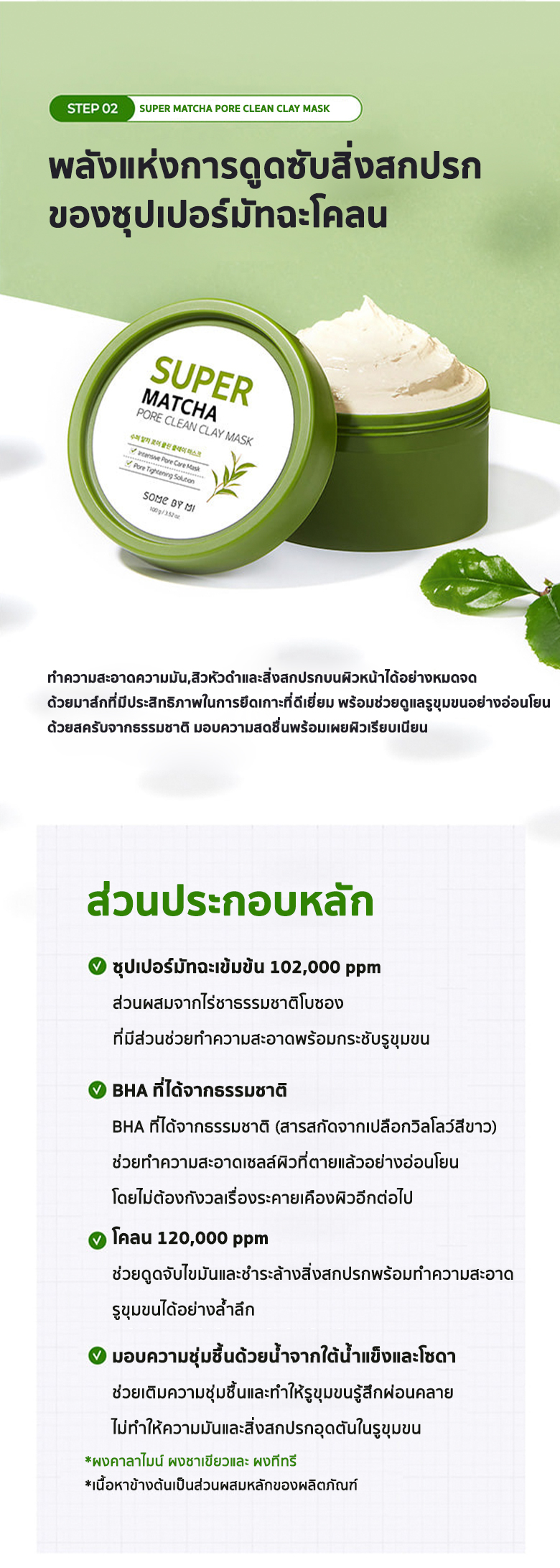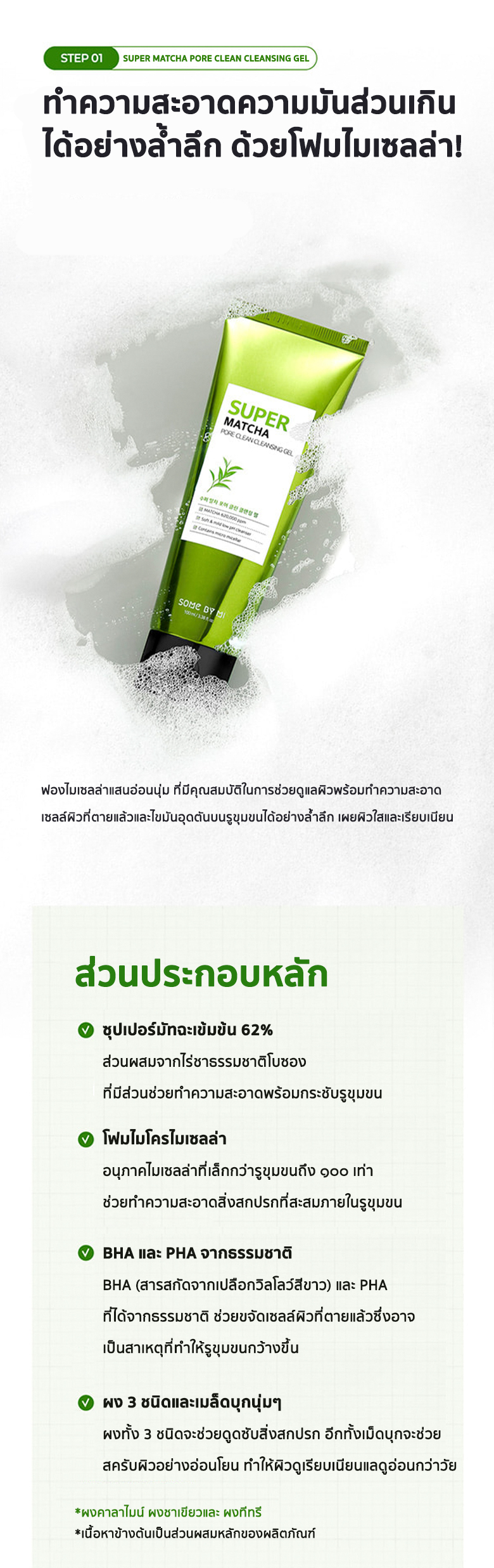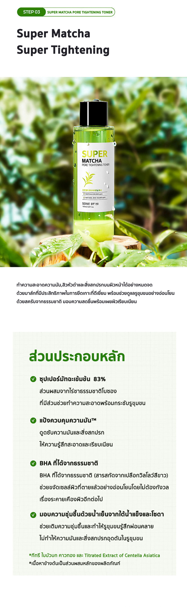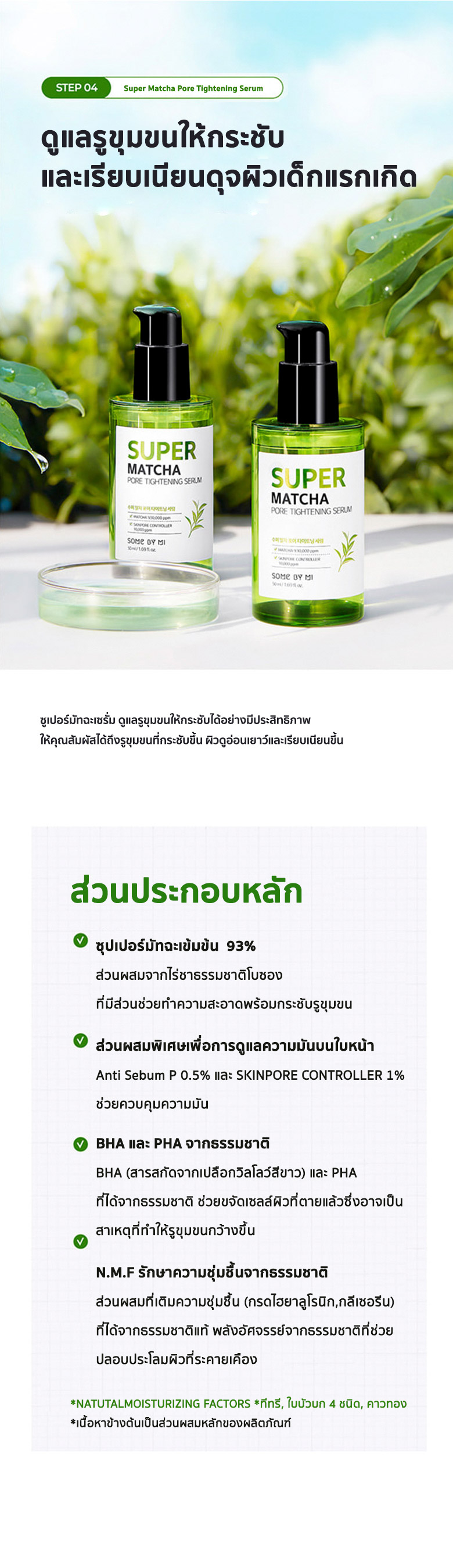 ด้วยพลัง SUPER MATCHA ควบคุมความมันส่วนเกินซึ่งเป็นสาเหตุสำคัญที่ทำให้เกิดสิวประกอบไปด้วย1.SOME BY MI SUPER MATCHA PORE CLEAN CLEANSING GEL ขนาด 42 มิลลิลิตร2.SOME BY MI SUPER MATCHA PORE CLEAN CLAY MASK ขนาด 42 กรัม3.SOME BY MI SUPER MATCHA PORE TIGHTENING TONER ขนาด 30 มิลลิลิตร4.SOME BY MI SUPER MATCHA PORE TIGHTENING SERUM ขนาด 10 มิลลิลิตร