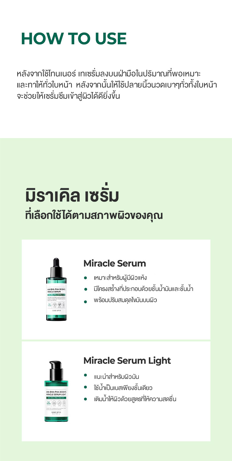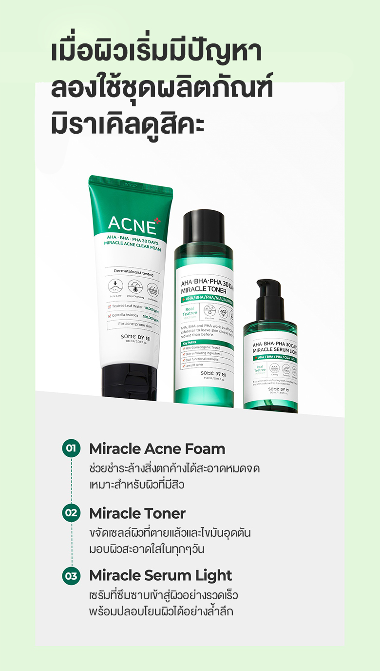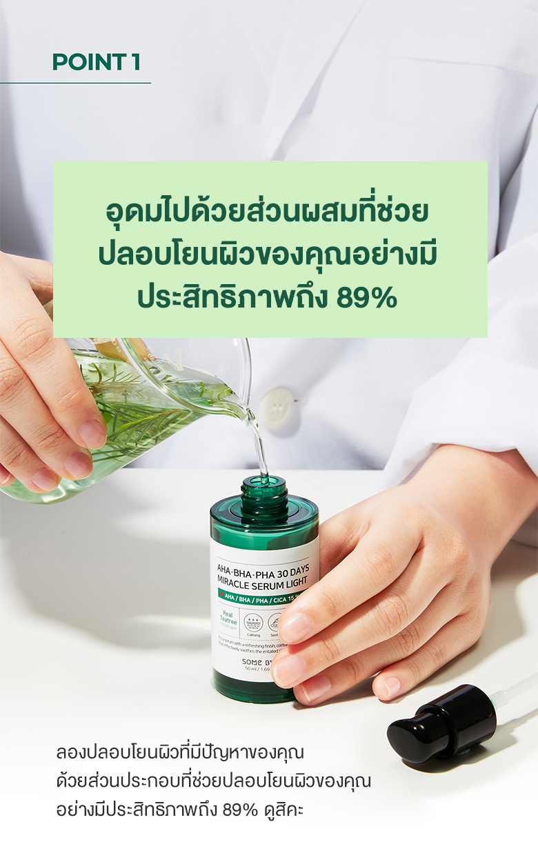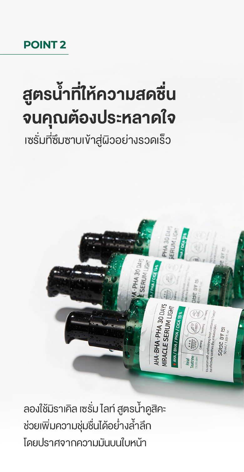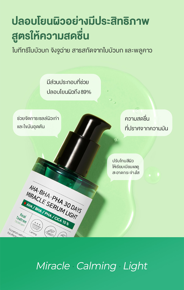 SOME BY MI AHA-BHA-PHA 30DAYS MIRACLE SERUM LIGHTเซรั่มที่มีส่วนผสมหลักจากธรรมชาติ ซึ่งอ่อนโยนต่อทุกสภาพผิวช่วยผลัดเซลล์ผิว ลดสิว กระชับรูขุมขน เผยผิวกระจ่างใสขึ้นใน 30 วันบางเบายิ่งขึ้น ซึมซับเข้าสู่ผิวได้ดียิ่งขึ้นAHA, BHA และ PHA ช่วยทำให้ผิวกระจ่างใสและสุขภาพดีอย่างสม่ำเสมอโดยการขจัดเซลล์ที่ตายแล้วและสิ่งสกปรกออกและปรับอัตราการผลัดเซลล์ผิวหนังสู่สภาวะปกติAHA - ขจัดสิ่งสกปรกและขุยแห้งที่ผิวด้านนอกBHA - ขจัดสิ่งสกปรกและซีบัมในรูขุมขนPHA - รักษาความชุ่มชื้นของผิวและละลายเซลล์ผิวที่ตายแล้วปริมาณสุทธิ 50 มิลลิลิตร